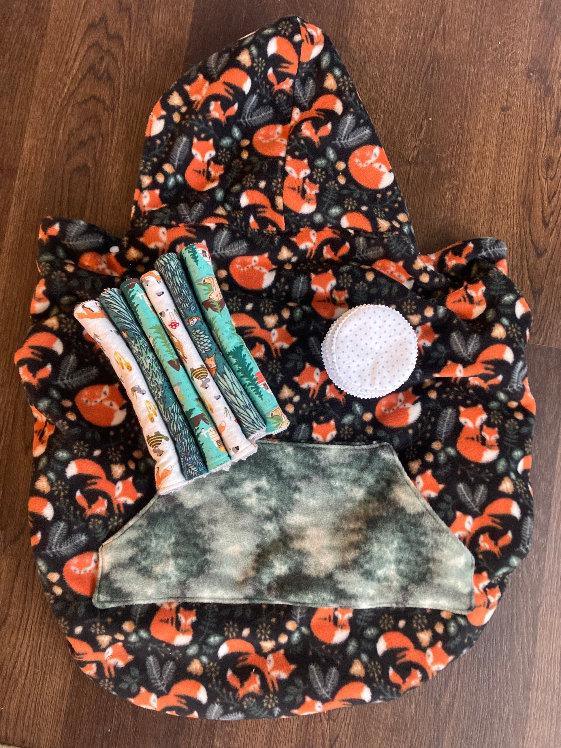 Introducing the New Baby Bundle - perfect for new parents! This bundle includes 6 absorbent flannel burp cloths, 10 pairs of reusable nursing pads for a comfortable and eco-friendly option, and a custom carrier cover with a hood and hoodie-style pocket. Keep your bundle of joy clean, fed, and cozy on the go.