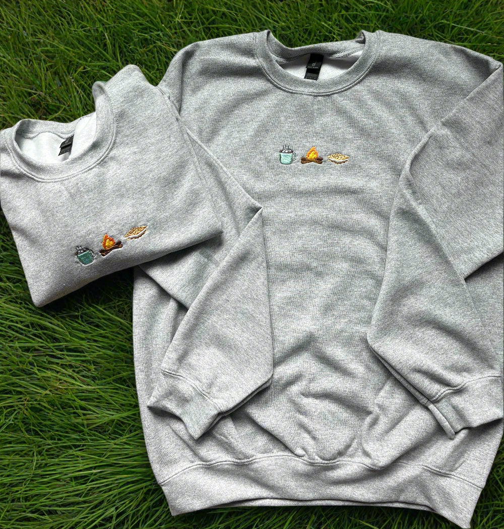 Introducing the Tiny Icon Embroidered Camping Crewneck, perfect for outdoor enthusiasts. Made with high-quality embroidery, this crewneck showcases iconic camping elements such as a mug, smore, and campfire. Stay cozy and stylish on your next adventure.