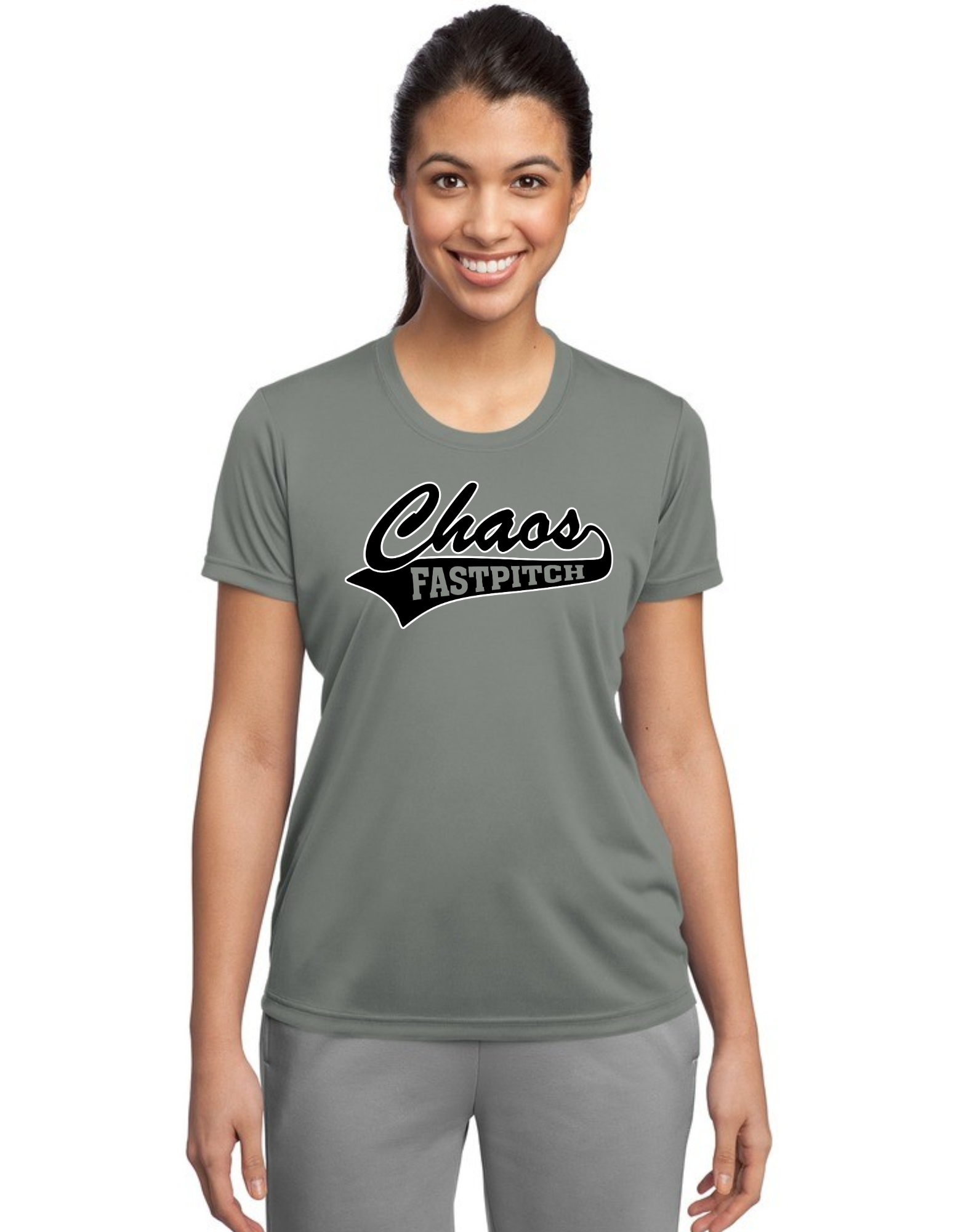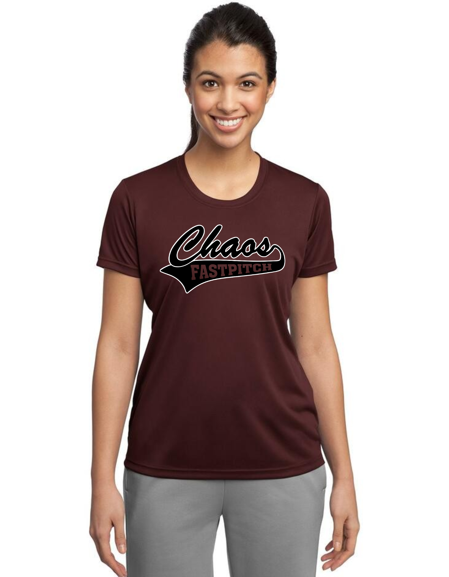 This high-performance Woman's Polyester Tee from Sport-Tek combines functionality with style. Featuring a distinctive chaos logo on a maroon and grey colorway, this moisture-wicking garment delivers superior breathability during physical activity while maintaining a structured silhouette. Engineered with durable polyester construction for extended wear and color retention.